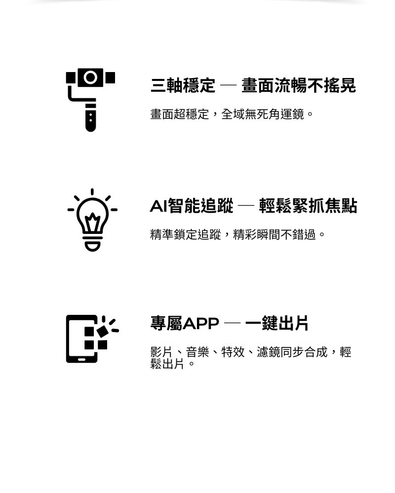 • 穩定性極佳:三軸防抖設計,畫面穩定無抖動。