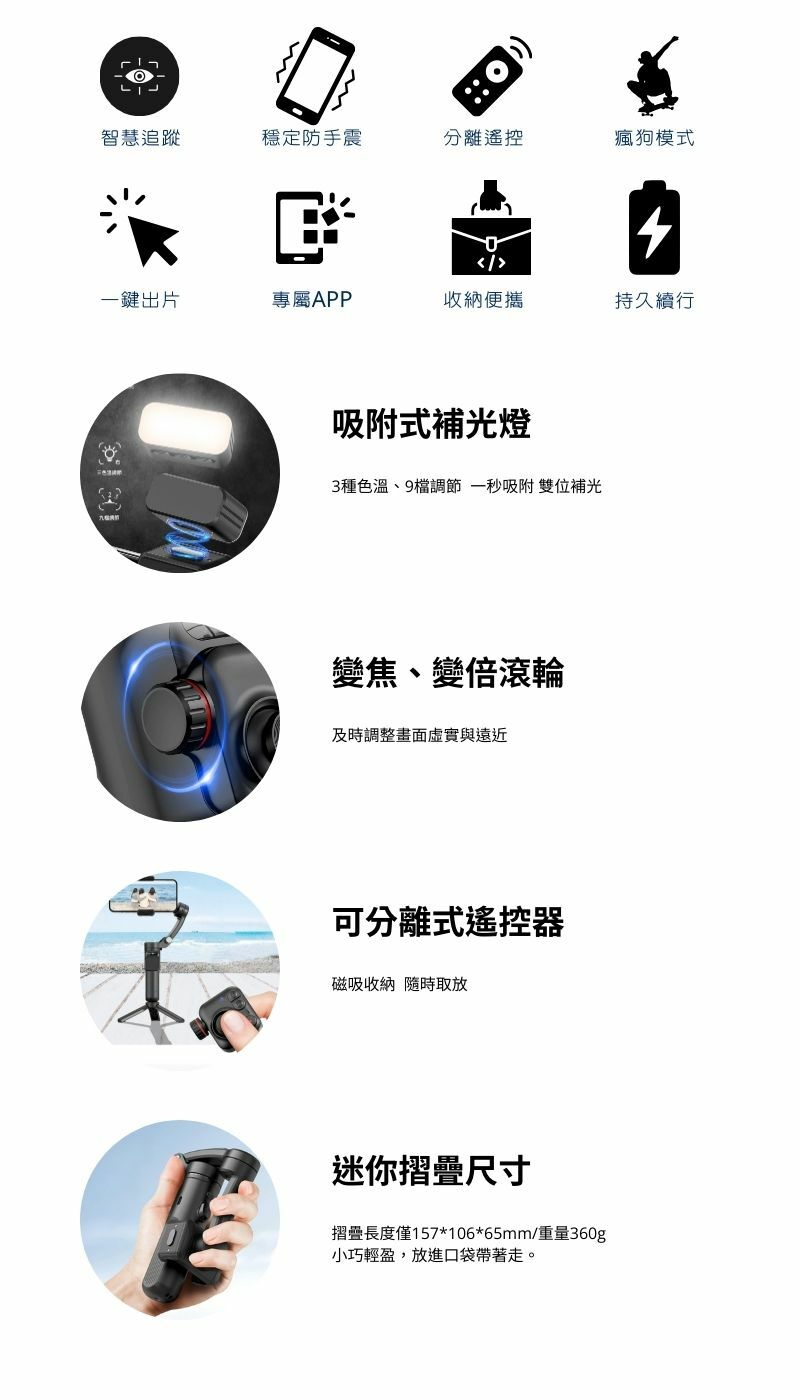 結合AI人臉追蹤、三軸防抖技術與多功能補光燈設計,M02適合自媒體創作者和戶外愛好者,不論橫拍或直拍,輕鬆實現穩定流暢的拍攝體驗。快來探索M02,讓每一段影像更加精彩!