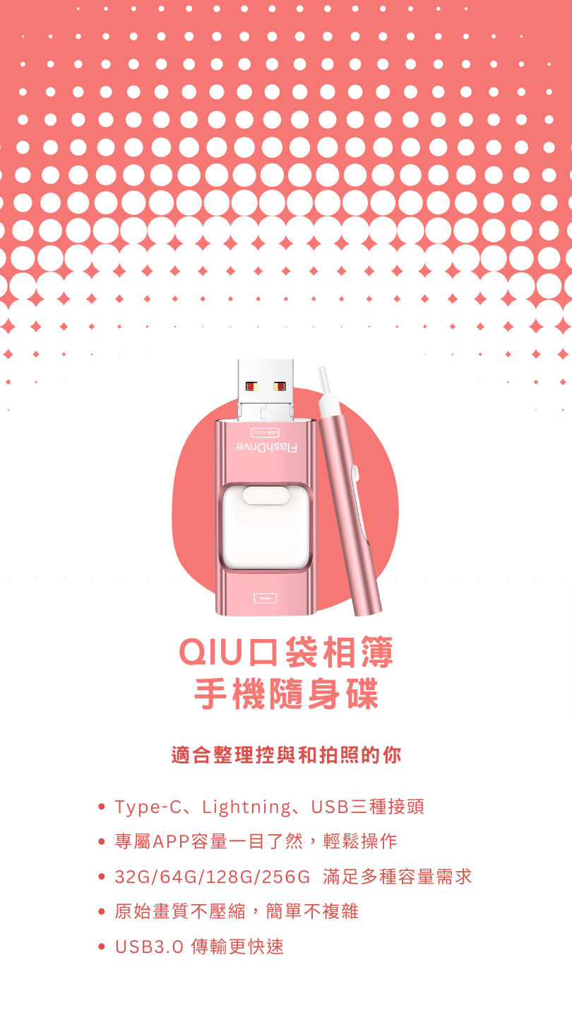 A:手機隨身碟可連接Mac與PC,寫入大概6-7M/S,讀取大約10-11M/S,連接iPhone與iPad,寫入沒有實際數據,經測試一分鐘大約能傳70張照片左右,使用方式與一般隨身碟方式一樣。